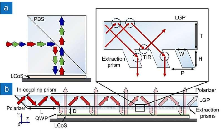 为了尽量减小LCoS系统的体积,研究人员提出了一种带有导光板(LGP)的超紧凑照明系统,以有效将所使用的光源引导至LCoS面板。